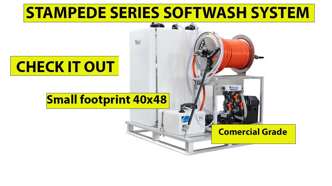 Check out the Stampede line of Soft Washing Systems. With a 40×48 inch footprint the Stampede is perfect to slide in a small truck or to attach to a small trailer. Powered by either a 12 volt or a 6.5HP gas engine and based on PowerWash.com’s professional grade Maverick and Stallion soft wash machines the Stampede will deliver years of ROI. Have a quick look as Adam describes the Maverick Stampede and check out both CLICK the links below. Ask about the FREE Training offer with each Stampede IN STOCK AND READY TO SHIP! Maverick Stampede: https://powerwash.com/shop/equipment/… Stallion Stampede: https://powerwash.com/shop/equipment/… Call us any time: 1-800-433-2113